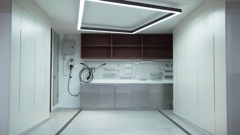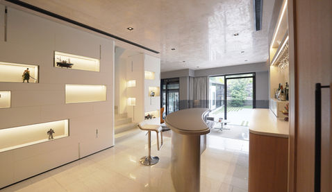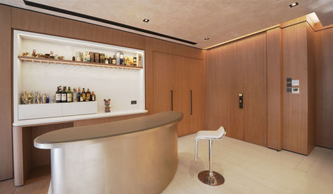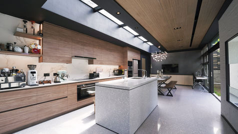 An impressive outdoor kitchen embraces a roofed outdoor dining area with a fireplace in the courtyard. The design of the spaces takes into consideration of entertainment, views, sunlight, and landscape. House owners could enjoy the moment of cooking with family and friends in the outdoor kitchen
